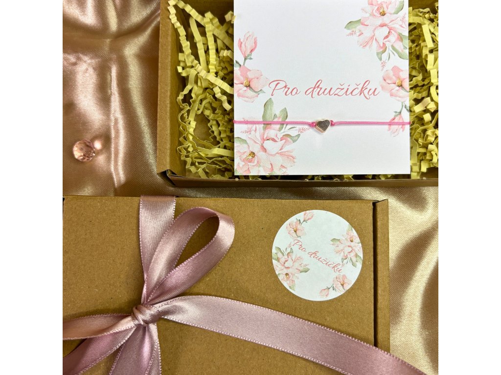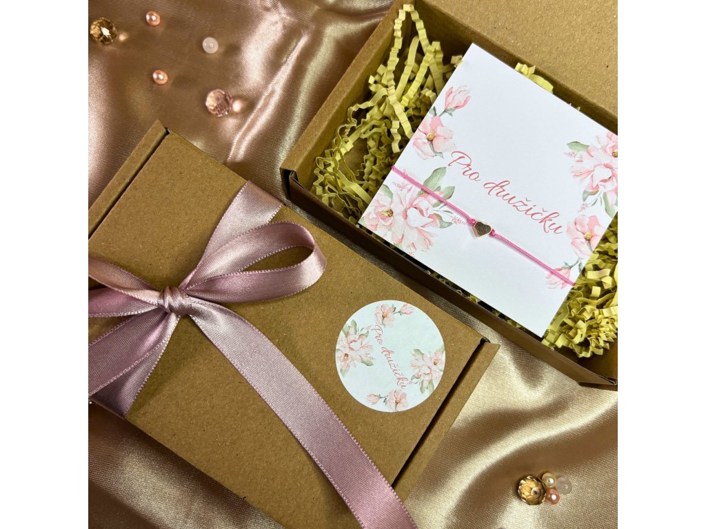 Dárkové balení s náramkem. Obsahuje krabičku s dřevitou vlnou, šňůrkový náramek a kartičku s nápisem. Krabička je zdobena růžovou stuhou.