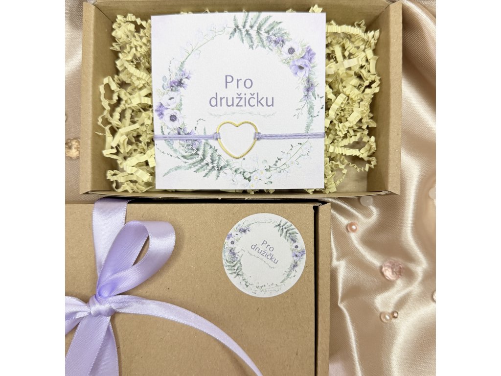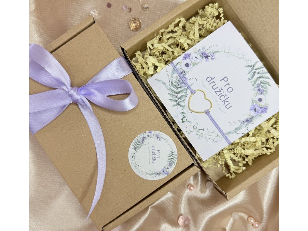 Dárkové balení s náramkem. Obsahuje krabičku s dřevitou vlnou, šňůrkový náramek a kartičku s nápisem. Krabička je zdobena stuhou.