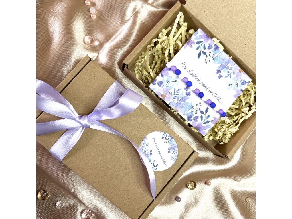 Dárkové balení s náramkem. Obsahuje krabičku s dřevitou vlnou, náramek a kartičku s nápisem. Krabička je zdobena stuhou.
