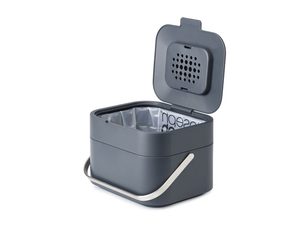 Nádobka na kompostovatelný odpad JOSEPH JOSEPH Stack 4 je navržena tak, aby redukovala zápach, který se přirozeně uvolňuje ze shromážděných zbytků jídla. Přispívá k tomu promyšlená ventilace snižující vlhkost - hlavní příčinu nepříjemného zápachu. Vzduch je přiváděn dvojitou stěnou a po cirkulaci v nádobě odváděn přes výměnný uhlíkový filtr umístěný ve víčku nádoby.