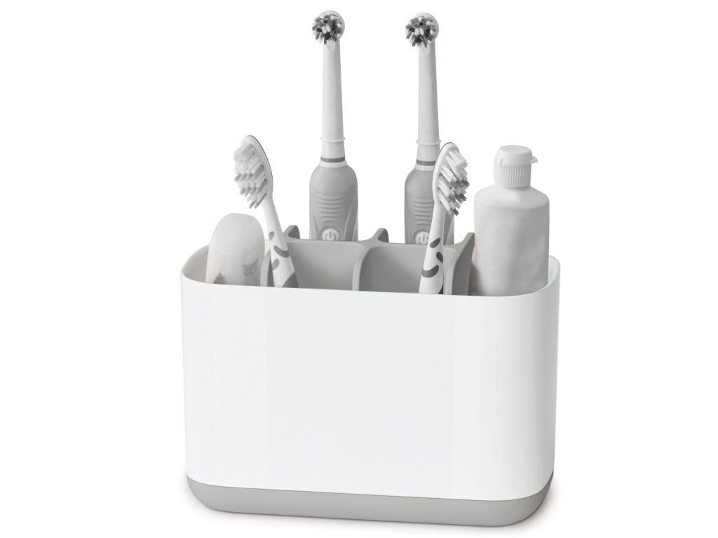 Stojánek rozdělený na několik sekcí poskytujících prostor pro běžné kartáčky, elektrické kartáčky, pastu a dentální nit. Snadno rozebratelný a čistitelný, s odvětrávacími otvory pro rychlé vysychání a protiskluznou základnou. Dodáván ve dvou velikostech