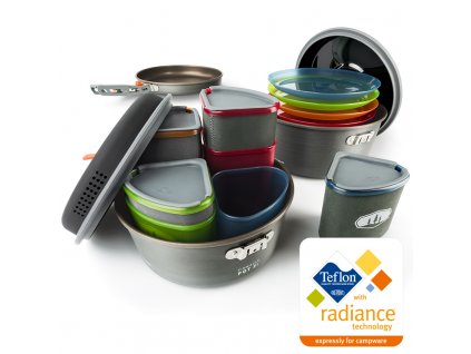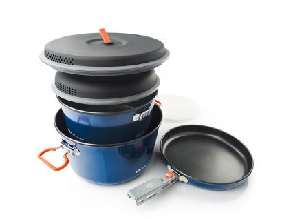 Robustní a spolehlivá skládací campingová sada 2 hrnců, pokliček, pánve, plastového prkénka a obalu, který slouží také jako nádoba na umytí nádobí. Povrch je chráněn úpravou Pinnacle. Perforovaná poklička z BPA FREE plastu umožňuje bezproblémový únik par z hrnce a zároveň slouží jako sítko například pro slití vody z těstovin. Pohodlná skládací odnímatelná rukojeť zpříjemní vaše vaření. Ucha hrnců jsou izolována proti popálení a lze je zacvaknout do přesných zarážek tak, aby odolávaly vysoké teplotě. Pánev může také sloužit jako poklička. Plastové prkénko na dně kastrolu zabraňuje poškrábání povrchu hrnců.