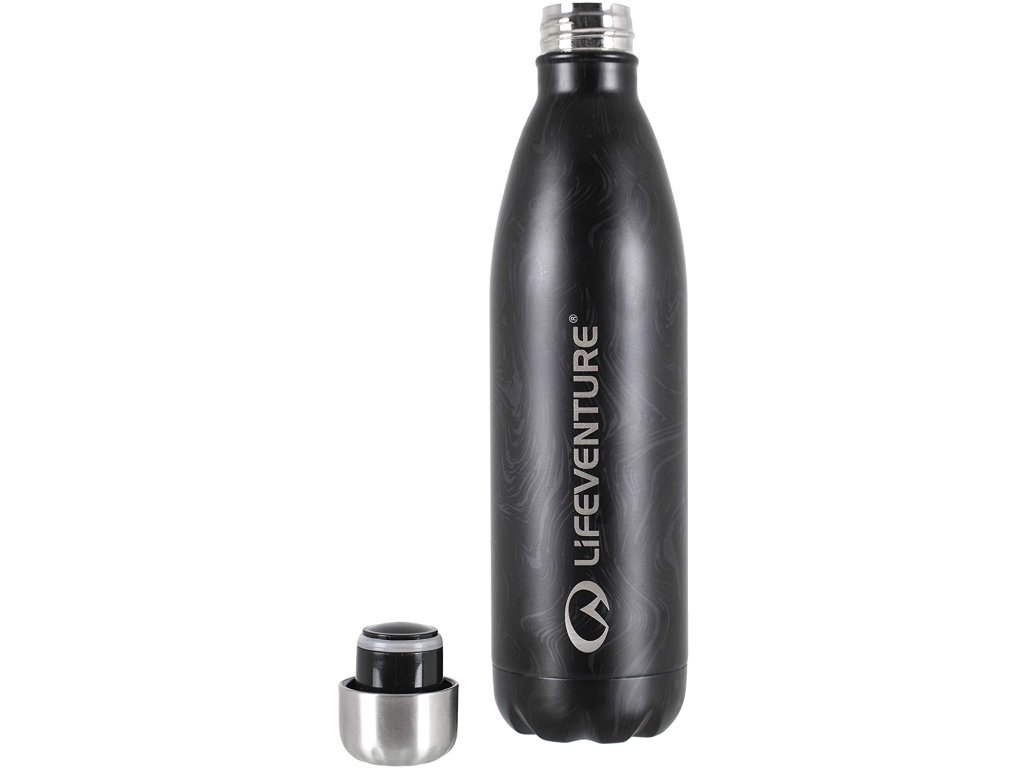 Dvouplášťová černá termoláhev z nerezu a šroubovacím uzávěrem. Termoláhev udrží horký nápoj po dobu 12h a studený 24h.