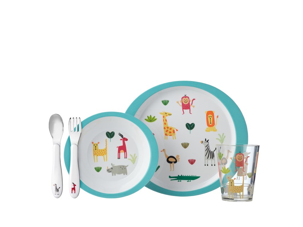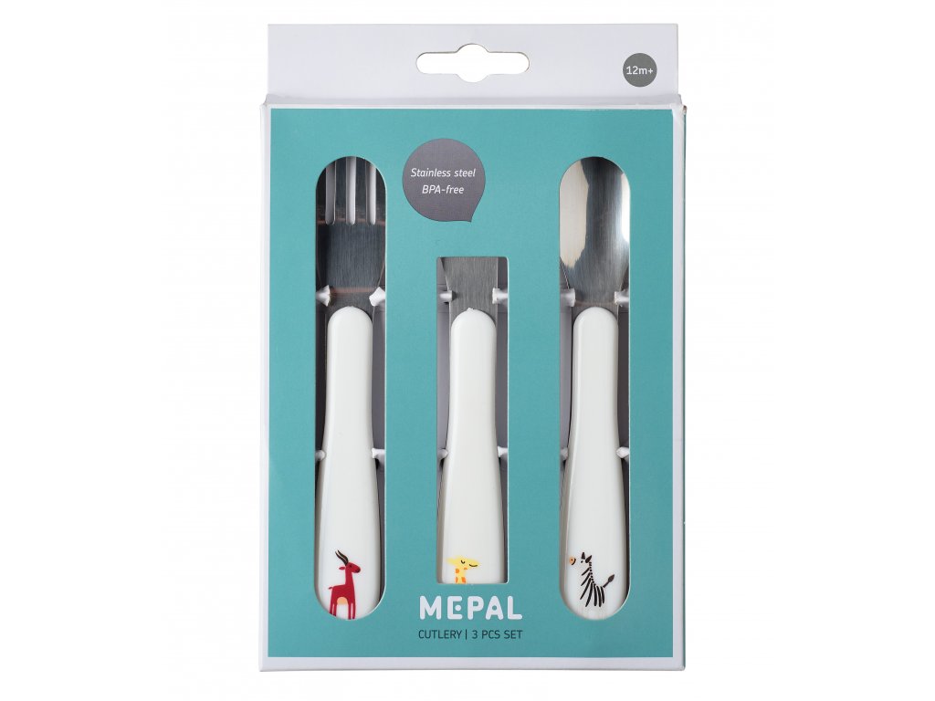 Třídílný příbor s potiskem Animal Friends. Tato sada příborů od firmy Mepal se skládá z malé vidličky, lžíce a nože a je zabalena v zábavném dárkovém balení. Na této bílé příborové sadě je roztomilý obrázek zvířátek. Krásné jako dárek pro miminko.