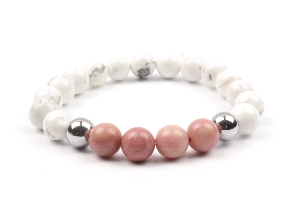Náramek je vyroben z bílého howlitu, doplněno rodonitem a hematitem o průměru 8mm.
