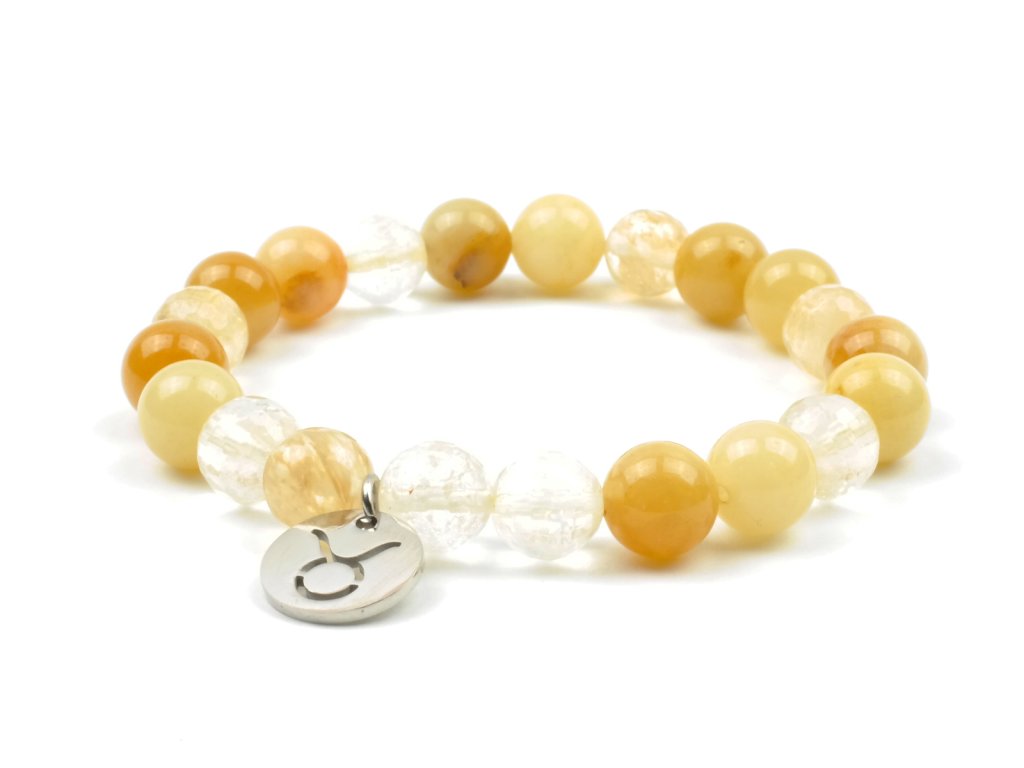 Náramek je vyroben z korálků topazu žlutého a citrínu broušeného o průměru 8 mm, přívěšek Kozoroh je z nerezové oceli.