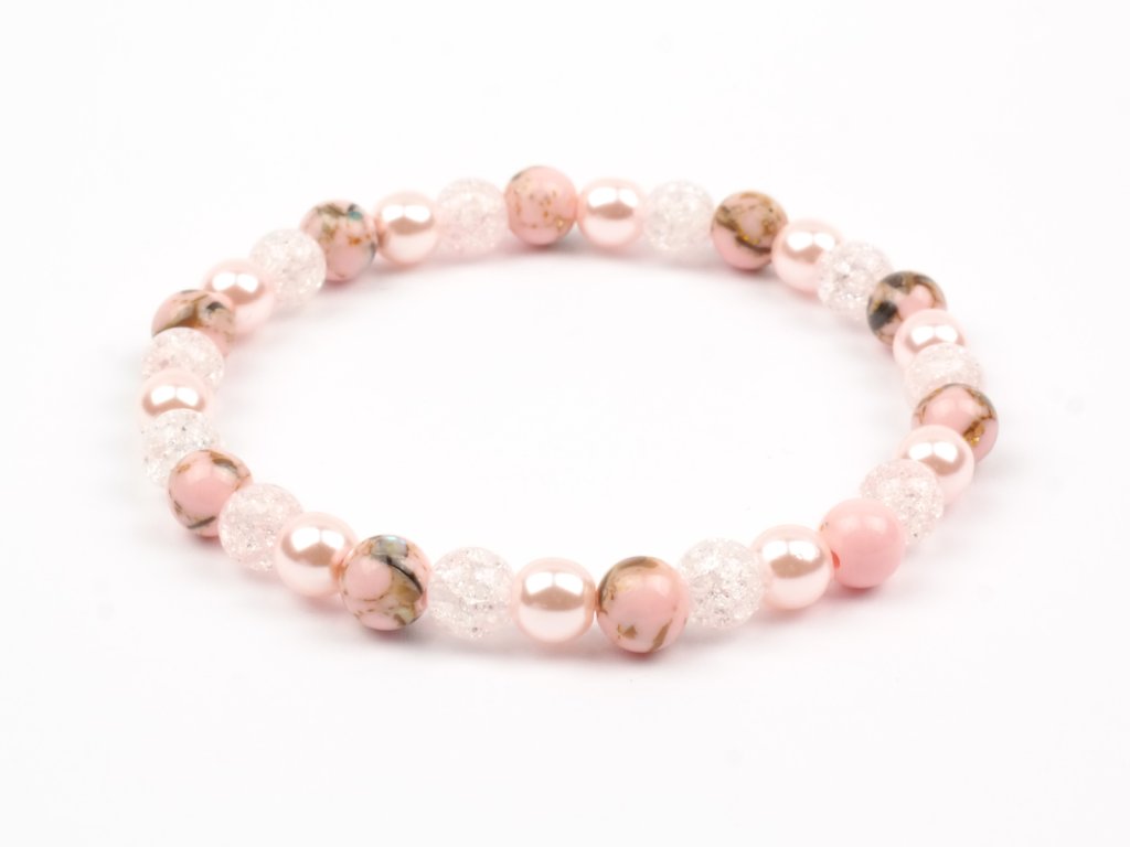 Náramek je vyroben z korálků růžového howlitu, křišťálu praskaného a skleněných voskovananých perel od českého výrobce Estrela. o průměru 6 mm.