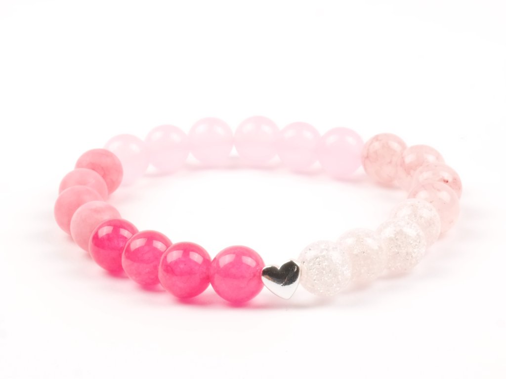 Náramek je vyroben z korálků jadeitu cherry, jadeitu růžového matného, jadeitu a křišťálu praskaného o průměru 8 mm, doplněno srdíčkem z hematitu.