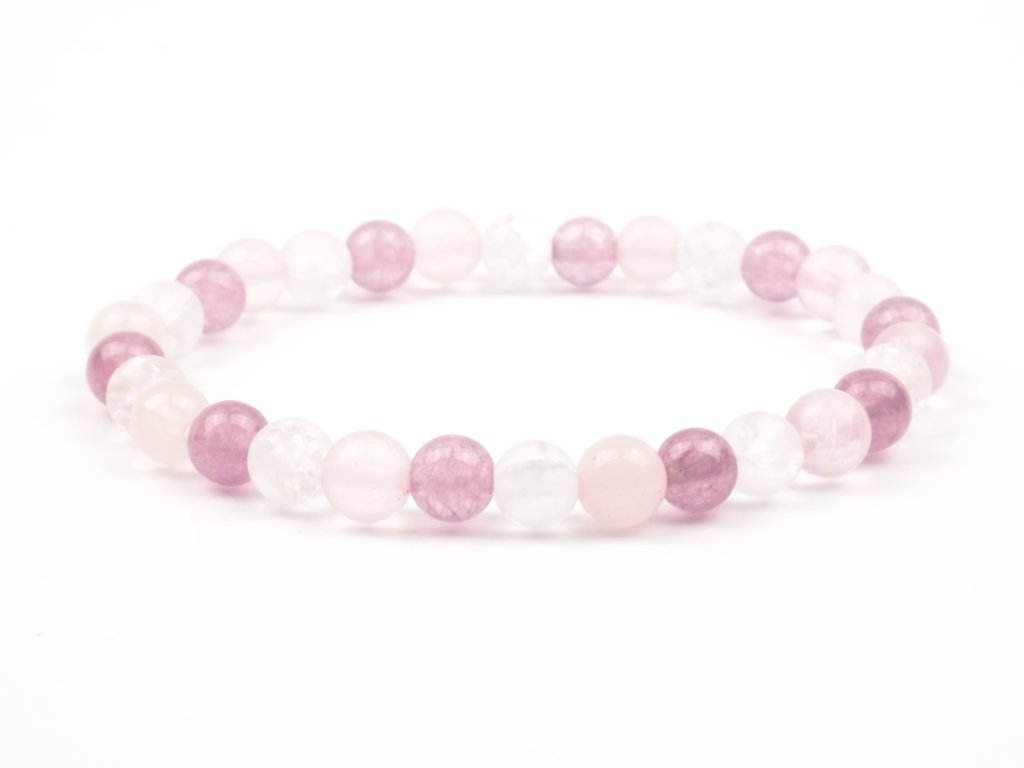 Náramek je vyroben z korálků jadeitu, růženínu a křišťálu praskaného matného o průměru 6 mm.
