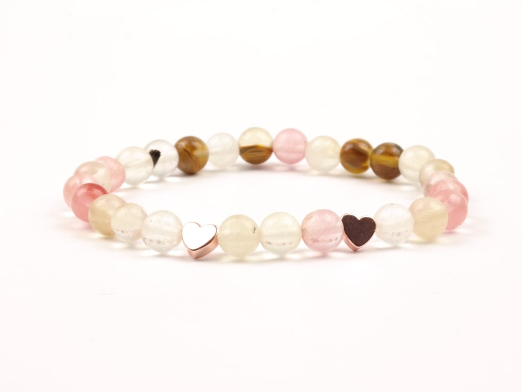 Náramek je vyroben z korálků melounového turmalínu o průměru 6 mm, doplněno srdíčky z pokoveného hematitu.
