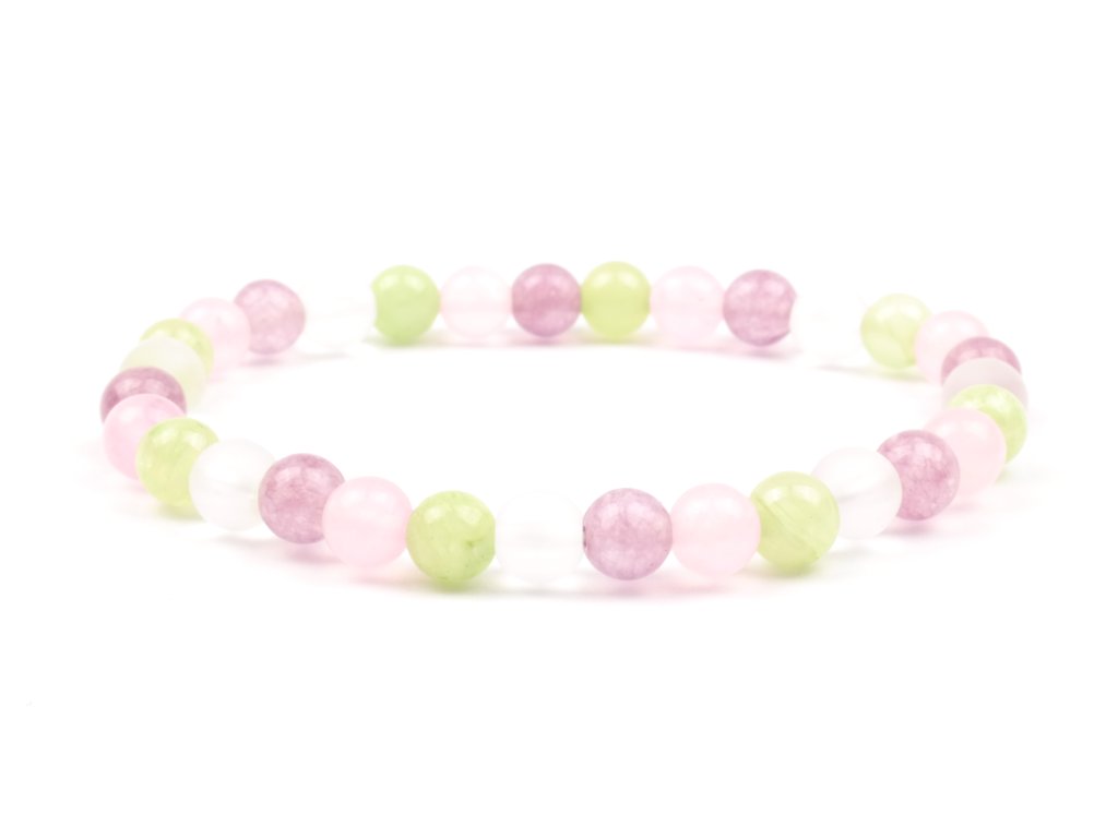 Náramek je vyroben z korálků jadeitu, jadeitu růženinového, nefritu zeleného a křišťálu matného o průměru 6 mm.