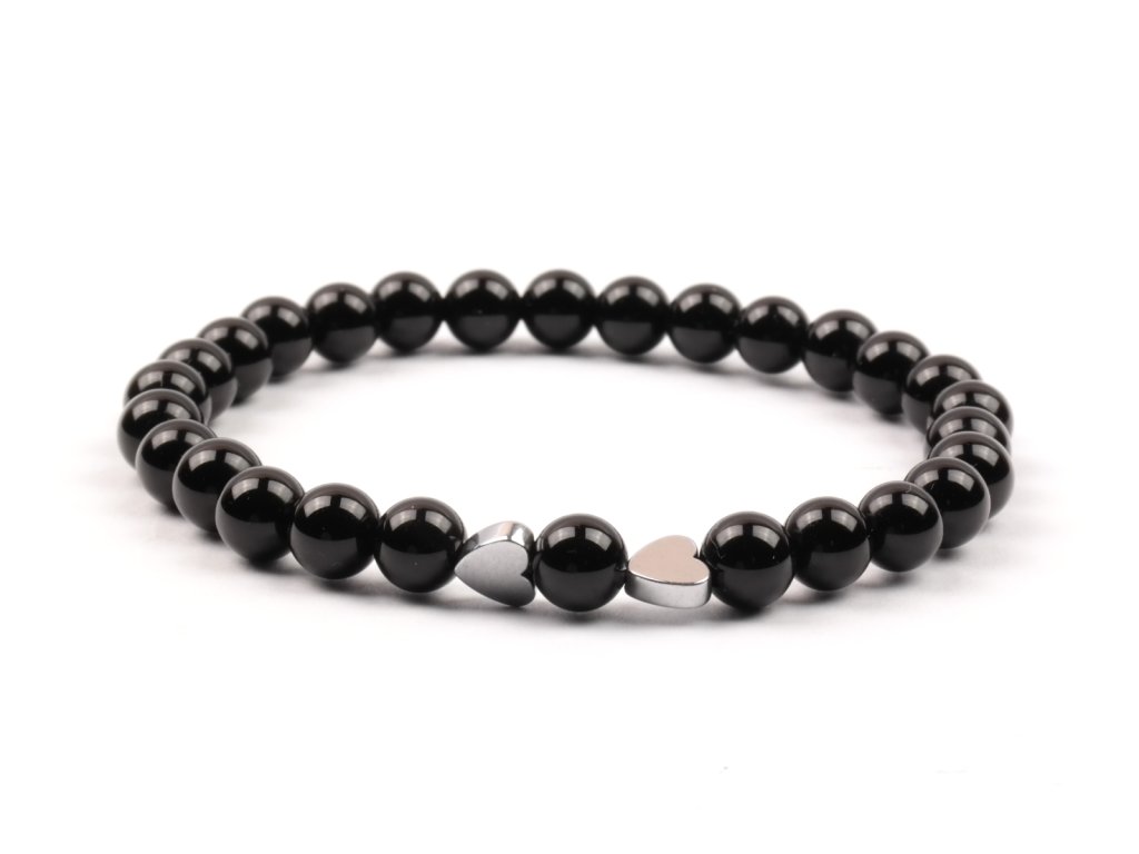 Náramek je vyroben z korálků onyxu o průměru 6 mm, doplněno hematitovým srdíčkem.
