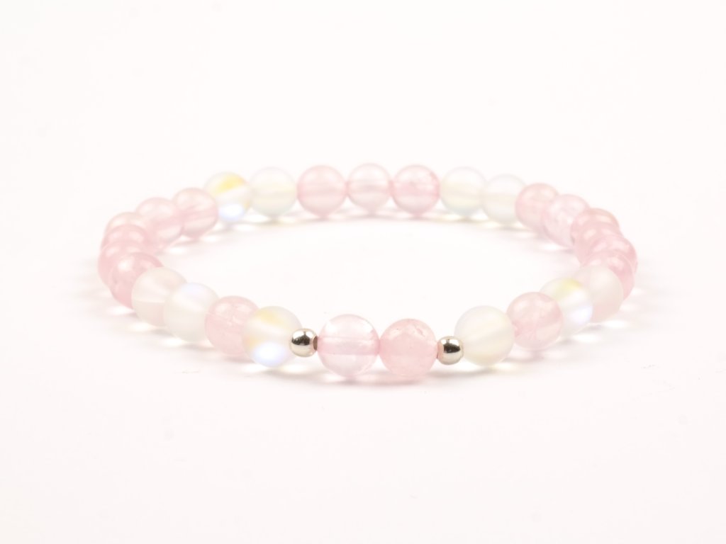 Náramek je vyroben z korálků růženínu a syntetického měsíčního kamene matného o průměru 6 mm, doplněno stříbrnými korálky.