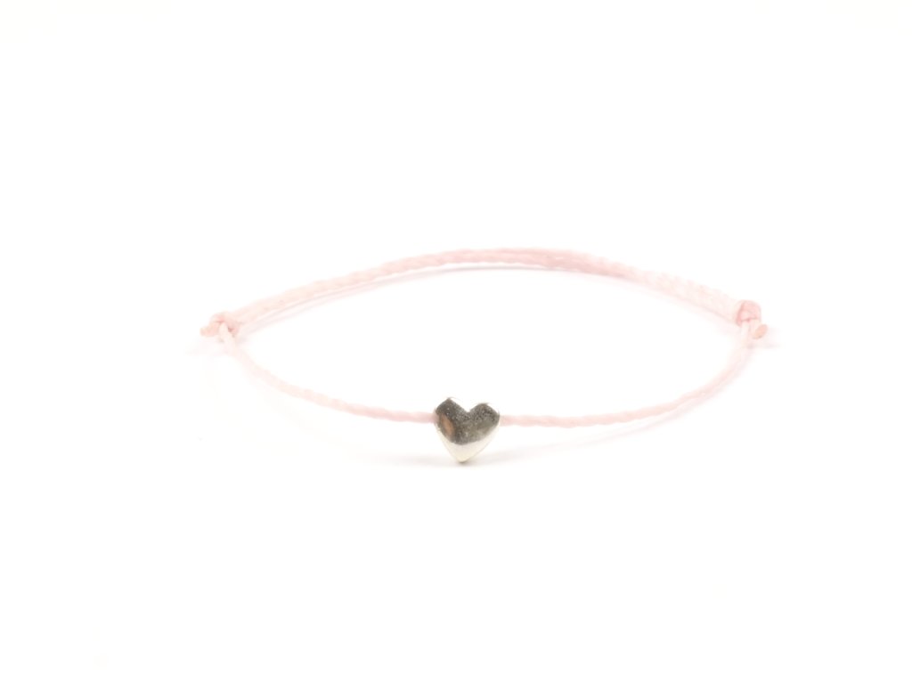 Náramek ze světle růžové povoskované nylonové šňůrky doplněn o hematitové srdíčko.