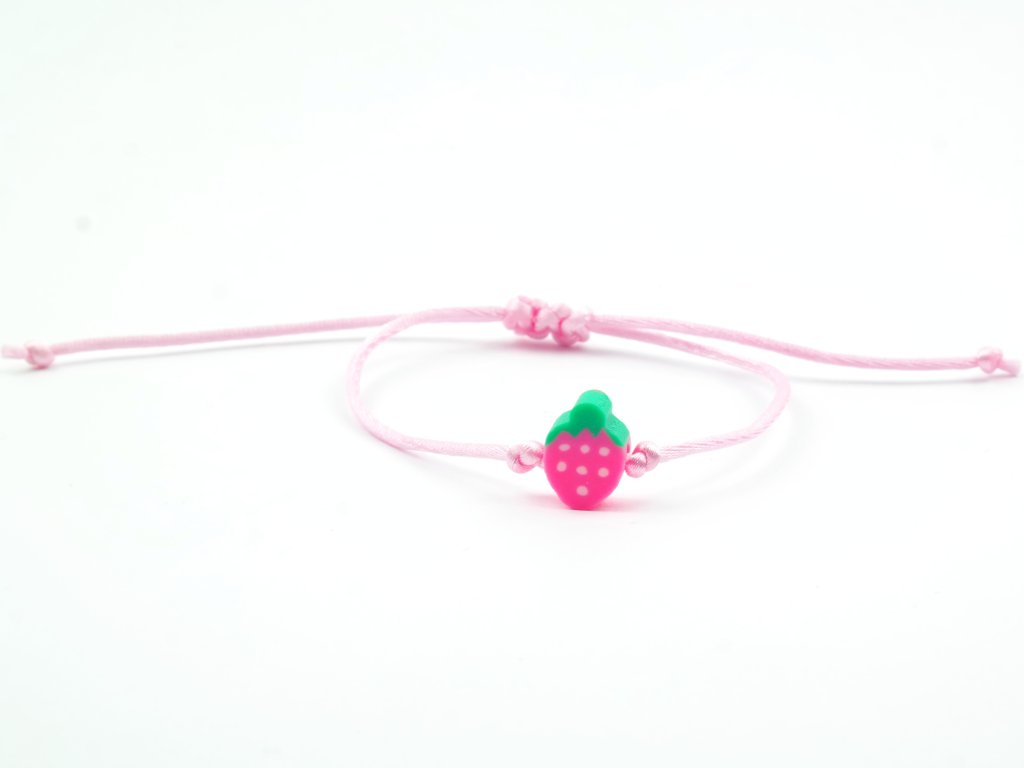 Náramek z růžové saténové šňůrky s jahůdkou.
