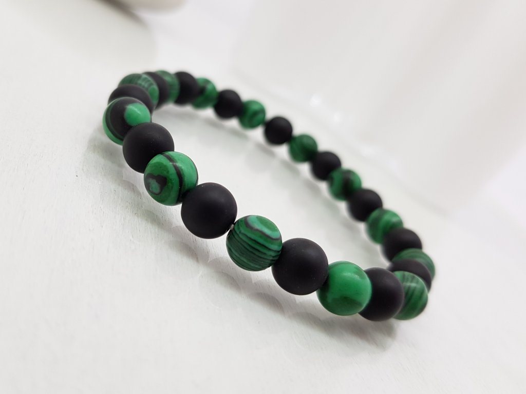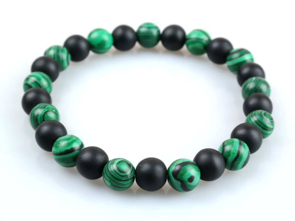 Pánský náramek z korálků matného onyxu a malachitu o průměru 8 mm.