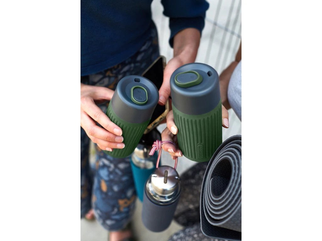 Odolný a lehký cestovní hrnek o objemu 340 ml. Chuťově neutrální díky vnitřní skleněné nádobě vyrobené z borosilikátového skla. Vnější silikonový obal je protiskluzový a snadno uchopitelný. Ve šroubovacím víčku je uzamykatelný uzávěr pítka, který lze snadno obsluhovat jednou rukou. Hrnek je 100% nepropustný. Je ideální nádobkou na ranní kávu pasující do nápojového držáku ve vašem autě. Lze jej umístit i do běžných držáků na kole. Všechny díly hrnku lze mýt v myčce. Geniálně je vymyšlen uzavírací mechanismus pítka, který lze skutečně celý, do posledního dílku, snadno rozebrat a důkladně tak očistit každou hranu a záhyb od případných zbytků kávy.