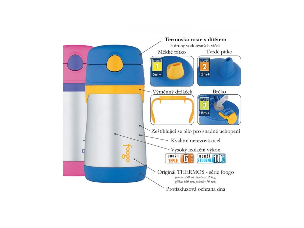 Vakuově izolovaná termoska Foogo je termoska s brčkem pro nejmenší děti. Na jedno tělo termosky je možné nasadit tři různé uzávěry podle věku a potřeb dítěte. Měkké pítko pro děti od 6. měsíce (stupeň 1), tvrdé pítko pro děti od 12. měsíce (stupeň 2) a brčko pro děti od 18. měsíce (stupeň 3) - s tímto pítkem je termo-láhev dodávána. Termoláhev a jednotlivá pítka jsou navržena tak, aby se děti dokázaly sami napít. Termoska Foogo udržuje požadovanou teplotu nápojů po dlouhou dobu, je lehká, snadno se vejde do batohu, kočárku, či držáku nápojů v automobilu.