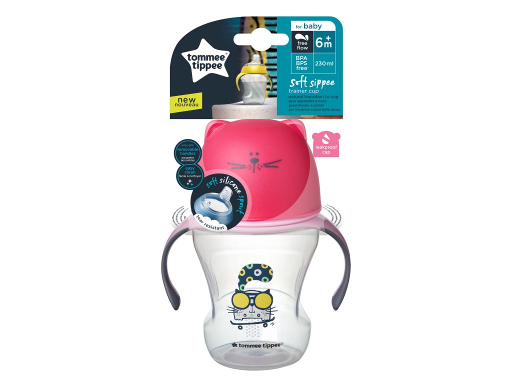 Hrnek s měkkým silikonovým pítkem má držadla pro snadné uchopení malými dětskými ručičkami. Měkký materiál pítka je ideální pro citlivé dásně dítěte při prořezávání prvních zoubků. Odnímatelné víčko chrání čistotu pítka na cestách.