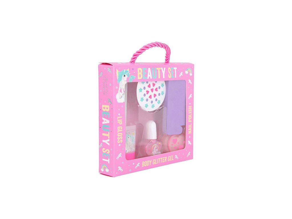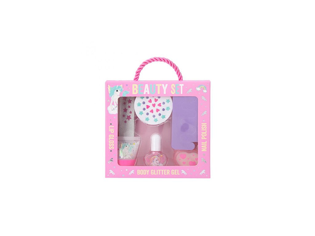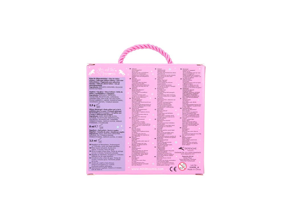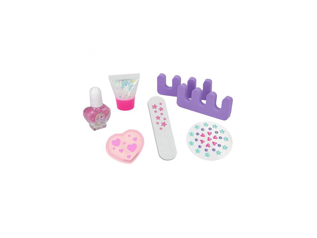 Obsah balení: lesk na rty 2,5 g, třpytivý tělový gel 8 ml, lak na nehty 3,5 ml, pilník na nehty, oddělovače prstů a barevné samolepky.